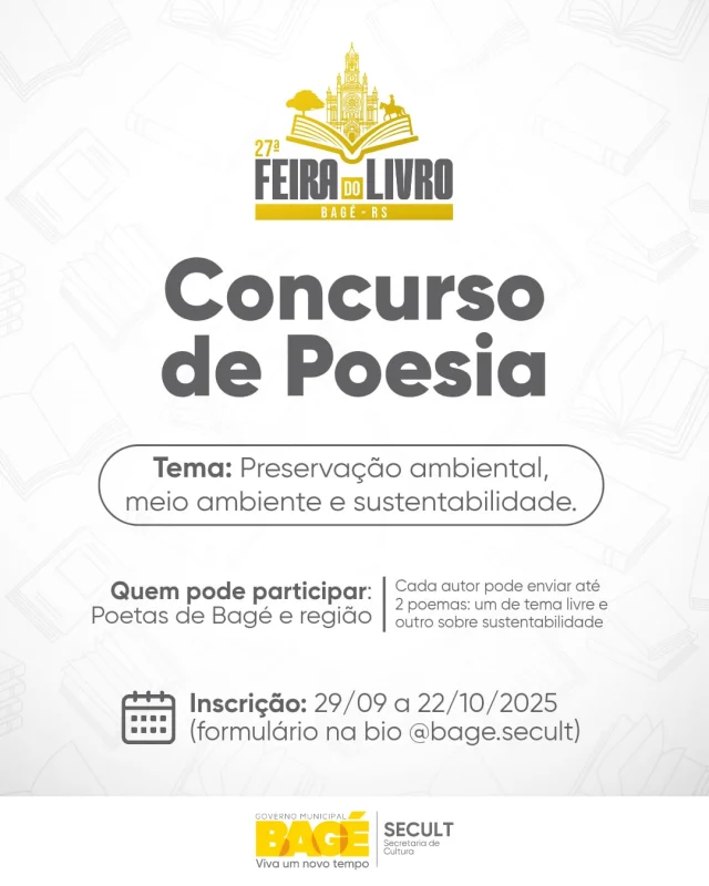 Concurso de poesia com inscrições abertas até 22-10-2025, organizado por Secretaria de Cultura de Bagé. As categorias temáticas aceitas são: gênero/tema livre.