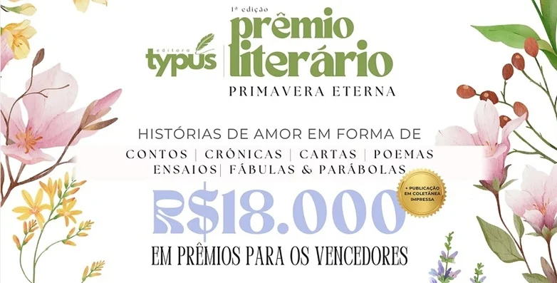 Concurso de cartas, contos, crônicas, ensaios e poesia com inscrições abertas até 30-11-2025, organizado por Editora Typus. As categorias temáticas aceitas são: gênero/tema livre.
