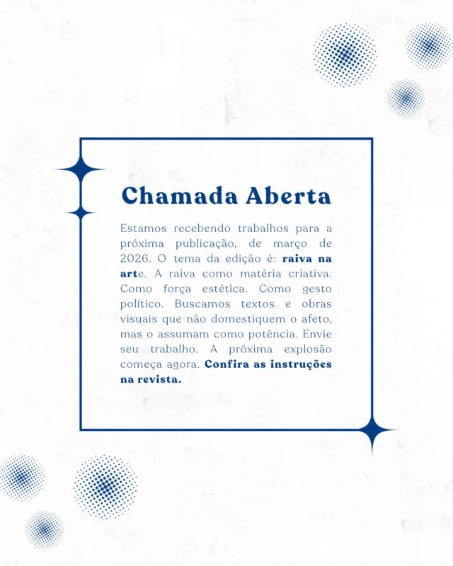 "A SUPERNOVA nasce sabendo que nenhuma explosão acontece sozinha. Se esta primeira edição se dedica a investigar o rompimento, a próxima será atravessada por aquilo que se move depois, quando a poeira ainda não baixou e a forma ainda não se estabilizou. Por isso, abrimos chamada para a edição de março de 2026 da revista. Buscamos artes que dialoguem com o tema da próxima edição, em diferentes formas de escrita. A SUPERNOVA é um espaço de curadoria e escuta. Nesta etapa, a revista não trabalha com cachê, mas oferece edição cuidadosa, publicação digital e circulação institucional junto à Andrômeda Editora." (Andrômeda Editora)